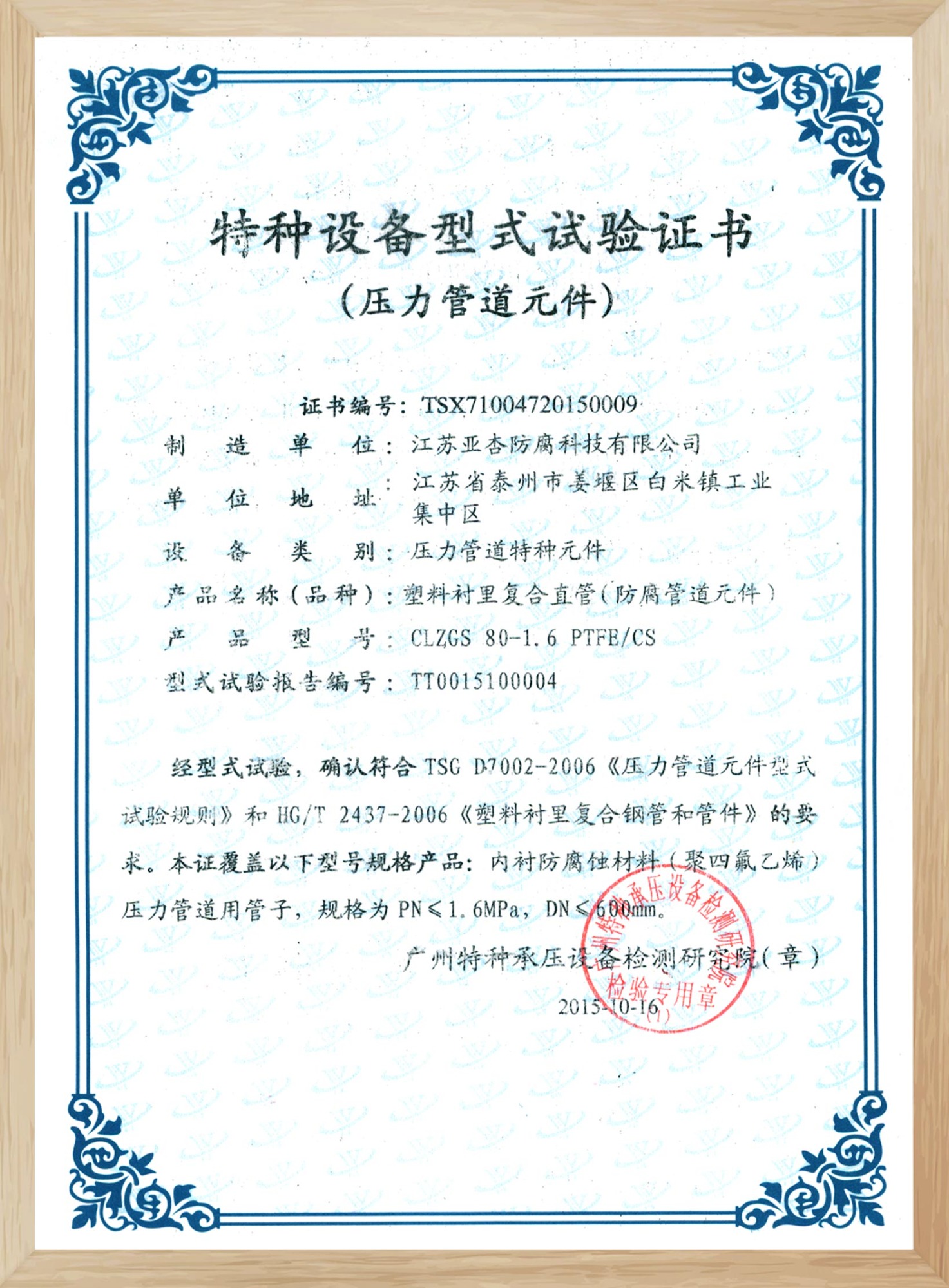 特種設備型式試驗證書